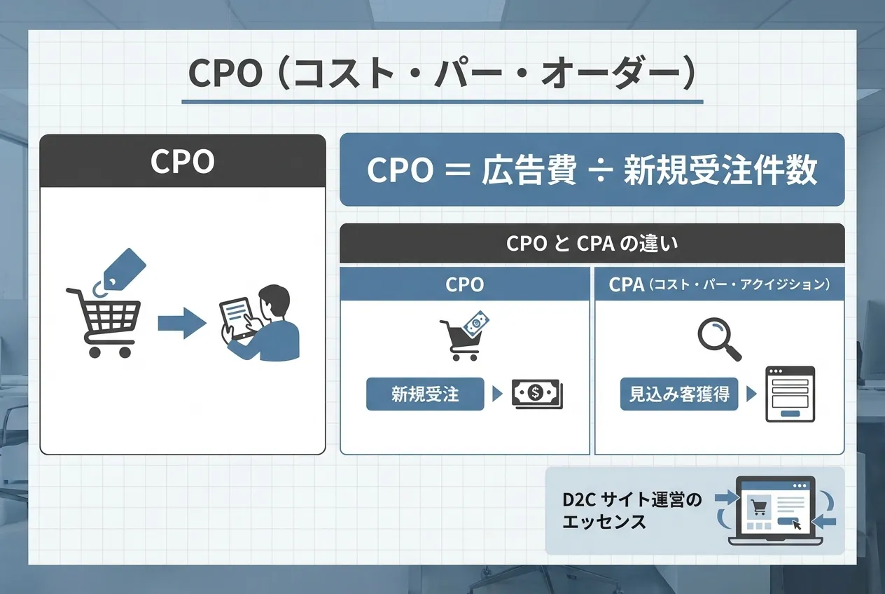 D2Cサイト運営において、広告費をどこまで許容できるかを判断するためには、まず「CPO(Cost Per Order)」という指標を正しく理解することが重要です。ここでは、CPOの定義と計算式、そしてCPAとの違いを整理しましょう。