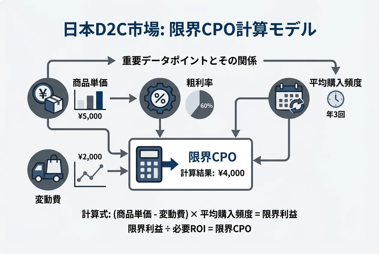 限界CPOとは、赤字にならずに新規顧客を獲得できる「広告費の上限ライン」を示す指標です。 計算式は「年間顧客単価 × 粗利率」が基本となり、D2C事業の収益性を判断する重要な基準として活用されています。