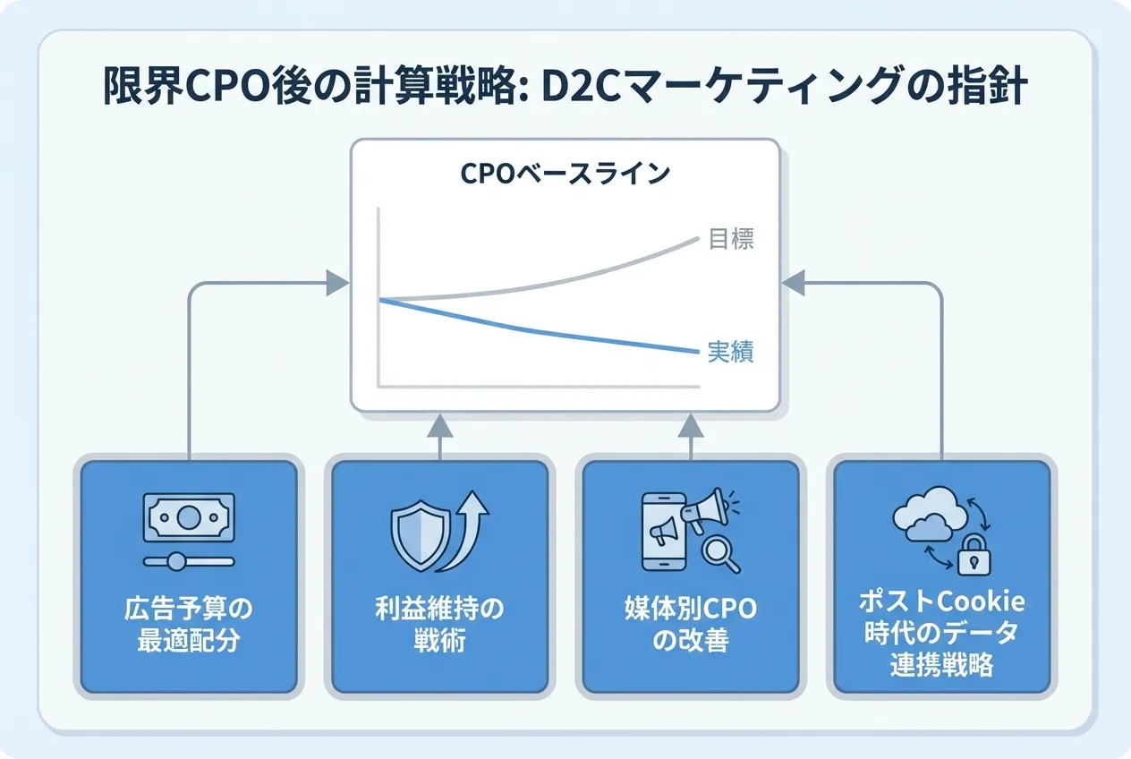 限界CPOは、D2C事業における広告投資の判断基準として欠かせない指標です。本記事のポイントを整理すると、以下のとおりです。