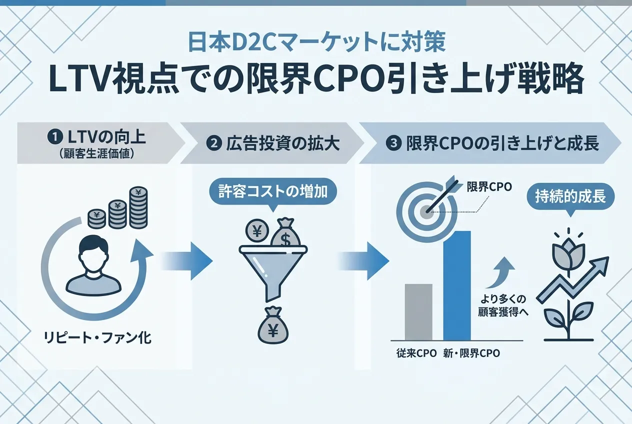 限界CPO(広告費許容ライン)は、LTV(顧客生涯価値)を高めることで「より高い広告投資を許容できる体制」へ引き上げることができます。特にD2Cでは、初回購入後の継続率が利益構造を左右するため、LTVを中心に広告戦略を最適化することが重要です。