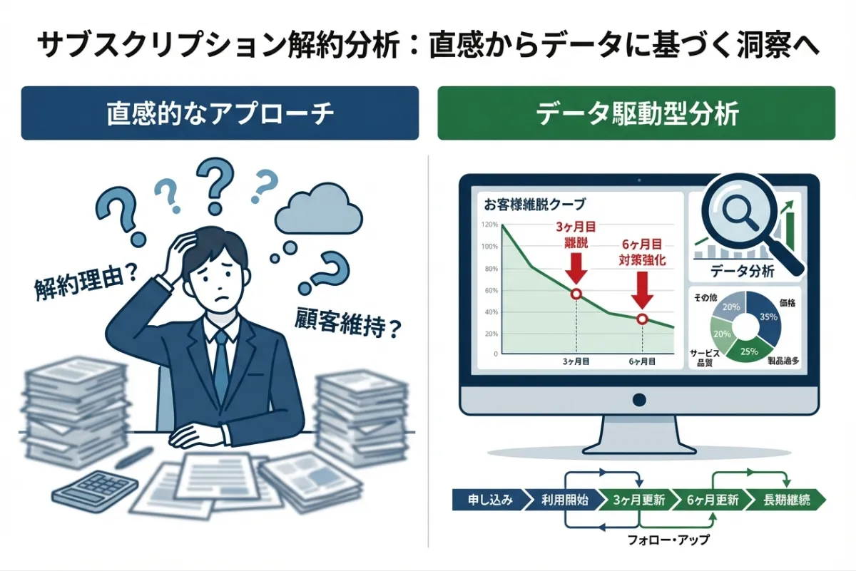 解約対策を行う上で最も危険なのは、原因を推測だけで決めつけて対策を打ってしまうことです。システムに蓄積されたデータを活用し、事実に基づいた分析を行うことがスタートラインです。