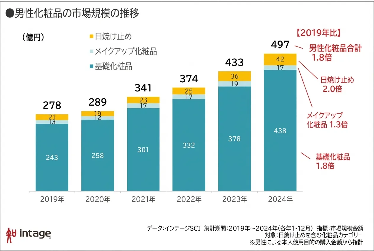 国内のメンズコスメ市場は、近年急速な成長を続けており、2024年の市場規模は約497億円に到達している。これは2019年と比較して約1.8倍に拡大しており、メンズ美容市場が一過性のトレンドではなく、定着フェーズに入ったことを示している。