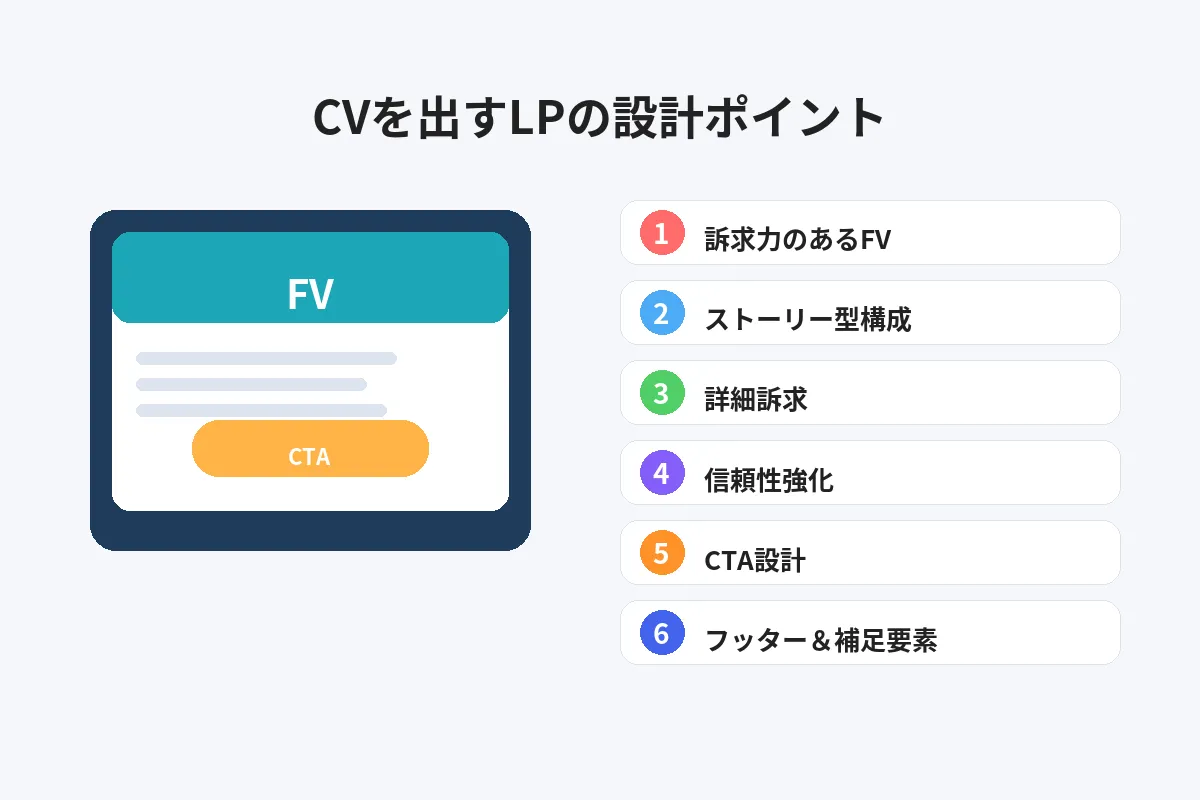 成果を出すためのLPを構築するには、デザイン性以上にユーザーの行動を適切に誘導できる構造・文脈・信頼設計が必要です。後述では、主要な設計ポイントに沿って解説します。