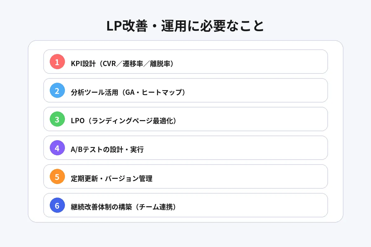 LPで成果を出し続けるには、制作だけでなく運用と改善の設計が不可欠です。以下の指標・ツール・体制を整えることで、LPを成果へとつなげます。